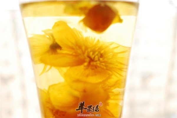 取贡菊2朵,金银花8朵,红枣1颗,胖大海1颗,莲子芯8粒,枸杞子5颗,西洋参1片,陈皮2片,冰糖适量,以沸水冲泡,当茶饮用。