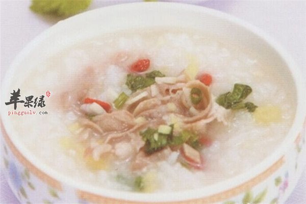 做法:先将羊肾去脂膜,切片,加水煮成汤待用,再用另一锅放入粳米。加水煮粥,待粥将熟时,加入煮好的羊肾和羊肾汤,加入枸杞,放入盐等调味品,再煮几开,即可。