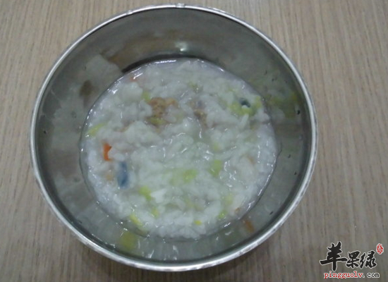 做法:鱼肉去掉鱼刺,切成鱼肉粒,在水中多泡几次,以便去腥;各种蔬菜粒备用;米粥在炉上煮好,水稍多些;先倒入鱼肉粒,再倒入蔬菜粒,最后加入丁点的盐调味即可。